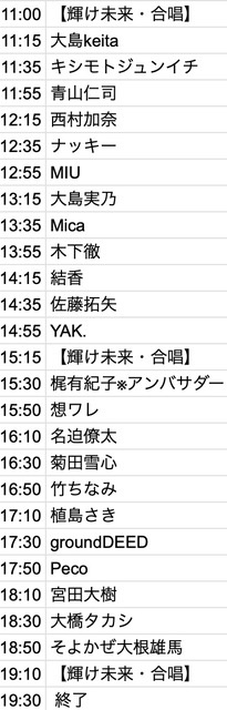 【出演】そよかぜ大根雄馬/菊田雪心/木下徹/植島さき/peco/西村加奈/キシモトジュンイチ/大橋タカシ/YAK.2/想ワレ/大島実乃/MIU/宮田大樹/まちこ&みゆ/ナッキー/竹ちなみ/佐藤拓矢/groundDEED/名迫僚太/ヴァジッサ ミンミン/Mica/大島keita